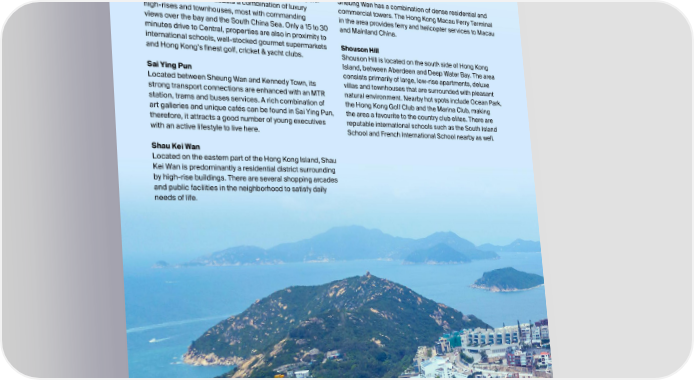 Quarry Bay Shek O Located on the eastern part of the Hong Kong Island, Shek O is a beachside area located in the south-eastern Quarry Bay transformed from an industrial area to a corner of Hong Kong Island. Its Shek O Beach is one of the commercial and residential neighborhood. The presence most popular beaches in Hong Kong, hence attracting lots of the large business hub, Taikoo Place, has brought of local people who desire to take a break from the hectic vibrancy to the place. city life to come. The area is scattered with townhouses and detached houses, while there are small village houses Repulse Bay nestled around the beach side. Repulse Bay is a bay in the southern part of Hong Kong Sheung Wan Island. Famous of its beautiful Repulse Bay Beach with a Sheung Wan has a combination of dense residential and relaxed resort-like atmosphere, the area is highly popular commercial towers. The Hong Kong Macau Ferry Terminal among expatriates. It boasts a combination of luxury in the area provides ferry and helicopter services to Macau high-rises and townhouses, most with commanding and Mainland China. views over the bay and the South China Sea. Only a 15 to 30 minutes drive to Central, properties are also in proximity to Shouson Hill international schools, well-stocked gourmet supermarkets Shouson Hill is located on the south side of Hong Kong and Hong Kong’s finest golf, cricket & yacht clubs. Island, between Aberdeen and Deep Water Bay. The area Sai Ying Pun consists primarily of large, low-rise apartments, deluxe Located between Sheung Wan and Kennedy Town, its villas and townhouses that are surrounded with pleasant strong transport connections are enhanced with an MTR natural environment. Nearby hot spots include Ocean Park, station, trams and buses services. A rich combination of the Hong Kong Golf Club and the Marina Club, making art galleries and unique cafés can be found in Sai Ying Pun, the area a favourite to the country club elites. There are therefore, it attracts a good number of young executives reputable international schools such as the South Island with an active lifestyle to live here. School and French International School nearby as well. Shau Kei Wan Located on the eastern part of the Hong Kong Island, Shau Kei Wan is predominantly a residential district surrounding by high-rise buildings. There are several shopping arcades and public facilities in the neighborhood to satisfy daily needs of life. 10 GUIDE FOR LEASING A PROPERTY IN HONG KONG