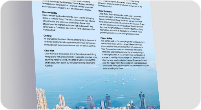 Neighbourhood Guide - Hong Kong Island Aberdeen Chung Hom Kok Aberdeen is an area situated on the southwest Hong Kong Located on the south side of Hong Kong Island, and Island and is mainly occupied by high-rise apartments nestled between Stanley and Repulse Bay, Chung Hom and industrial buildings. The area is conveniently linked by Kok is a quiet, predominantly low-rise neighborhood of highways and well served by public transportation. mainly luxury townhouses and low-rise blocks. Under the Ap Lei Chau radar for many expatriates, the area boosts a relaxed and The coastal area is located next to Aberdeen Harbour and enjoyable atmosphere with many of the homes having connected by the Ap Lei Chau Bridge. Many residents pools and private yards. Properties here on average travel to the city by the Aberdeen Tunnel. Luxury waterfront command relatively higher rentals than many areas of the developments in Ap Lei Chau overlook harbour views and Southern district. easily access to shopping and entertainment complex. Deep Water Bay Causeway Bay Deep Water Bay is an exclusive, quiet, luxury residential It is a densely built and one of the most popular shopping area situated on the South Side of Hong Kong Island. districts in Hong Kong. The area is dominated by a mixture Accommodations of Deep Water Bay are predominately of residential and commercial buildings. Some retail large detached houses with unobstructed seaviews. There shops have the highest rental per sq ft in the world. Key are easy accesses to the famous Deep Water Bay beach, landmarks in Causeway Bay include Time Square and the the Hong Kong Golf Club and also the Royal Hong Kong Victoria Park. Yacht Club. A number of international schools in close proximity are very popular among foreign families. Central Happy Valley As the Central Business District of Hong Kong, the area is Just a short walk to Causeway Bay but a world away from home to multinational corporations and retail complexes, the district’s buzzy activity, Happy Valley surprisingly consulates of many countries are also located in Central. gives people a unique suburban feel with a slow-pace Chai Wan vibe. The area is compacted with shops, restaurants Chai Wan is at the eastern end of the urban area of Hong and banks amongst the community, with everything all Kong island with predominantly residential area that enjoy in walking distance. It has an interesting combination of stunning harbour views. The area is well served by MTR a range of new high-rise buildings and traditional older- and buses, with about 20 minutes traveling distance to style low-rise apartments and houses. Properties located Central. near the Happy Valley Racecourse can enjoy spectacular racecourse views; while those located near the hill-foot can enjoy stunning city views. 8 GUIDE FOR LEASING A PROPERTY IN HONG KONG