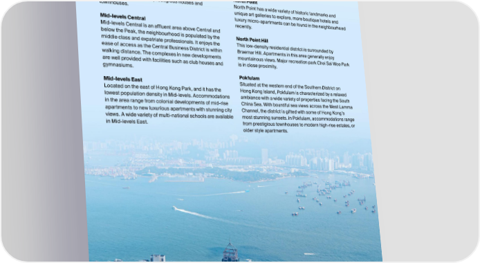 Jardine’s Lookout Mid-levels West Jardine’s Lookout is a luxurious residential area just above Situated between west of the Central district and Pokfulam, Happy Valley. It enjoys beautiful environment surrounded accommodation of Mid-levels West is predominantly high- by wooded hills and at the same time having a convenient rise apartment blocks that offer impressive harbor views and location with only ten minutes’ drive to the Central Central’s commercial skyline. Hottest eateries, traditional Business District. The community is well-equipped with shops and other amenities are also in close proximity. facilities and has easy accessibility to daily necessities. North Point Accommodations here range from luxury low-rise and North Point has a wide variety of historic landmarks and high-rise apartments to prestigious houses and unique art galleries to explore, more boutique hotels and townhouses. luxury micro-apartments can be found in the neighbourhood Mid-levels Central recently. Mid-levels Central is an affluent area above Central and North Point Hill below the Peak, the neighbourhood is populated by the This low-density residential district is surrounded by middle class and expatriate professionals. It enjoys the Braemar Hill. Apartments in this area generally enjoy ease of access as the Central Business District is within mountainous views. Major recreation park Choi Sai Woo Park walking distance. The complexes in new developments is in close proximity. are well provided with facilities such as club houses and gymnasiums. Pokfulam Mid-levels East Situated at the western end of the Southern District on Located on the east of Hong Kong Park, and it has the Hong Kong Island, Pokfulam is characterized by a relaxed lowest population density in Mid-levels. Accommodations ambiance with a wide variety of properties facing the South in the area range from colonial developments of mid-rise China Sea. With bountiful sea views across the West Lamma apartments to new luxurious apartments with stunning city Channel, the district is gifted with some of Hong Kong’s views. A wide variety of multi-national schools are available most stunning sunsets. In Pokfulam, accommodations range in Mid-levels East. from prestigious townhouses to modern high-rise estates, or older style apartments. GUIDE FOR LEASING A PROPERTY IN HONG KONG 9