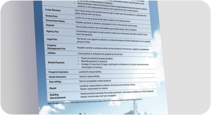 At a Glance Typical Lease Duration Two years (one year fixed and one year optional). — After the first year of a typical two-year lease, the tenant has the right to terminate the lease under the break clause. Written termination notice must be given to the Termination landlord two or three months in advance. — Early termination within the first year shall be negotiated between the tenant and the landlord to find replacement tenant and to determine the compensation. Lease Renewal Upon lease expiry, the landlord has the right to take back the property or negotiate the lease renewal with the tenant. Stamp Duty 0.25%-1% of the annual rental value, subject to the lease period. Government Rates Payable quarterly in advance, equivalent to 5% of the annual rental value. Deposit Two to three months’ rent, refundable upon lease expiry, free of interest. Agency Fee Commission equivalent to half month’s rental from the tenant and half month’s rental from the landlord. Legal Fee The tenant may appoint a solicitor to review the lease at his/her discretion for an agreed amount of fee. Property Payable monthly in advance either by the landlord or the tenant, subject to agreement. Management Fee Utilities Consumption is metered and payable by the tenant. — Fixed rent during the lease duration. Rental Payment — Monthly payment in advance. — A delay of more than 15 days could result in forfeiture of contract and premature termination of tenancy. Property Insurance Landlord’s responsibility. Home Insurance Tenant’s responsibility. Sub-letting Not an acceptable market practice. Repair Landlord: responsible for exterior, structure and common areas. Tenant: responsible for interior. Building Tenants should surrender the rental premises in the same condition as when originally Reinstatement leased, normal wear and tear excepted. Note: The above information is for reference only. In case of doubt, please refer to the relevant regulations or seek professional advice. GUIDE FOR LEASING A PROPERTY IN HONG KONG 21